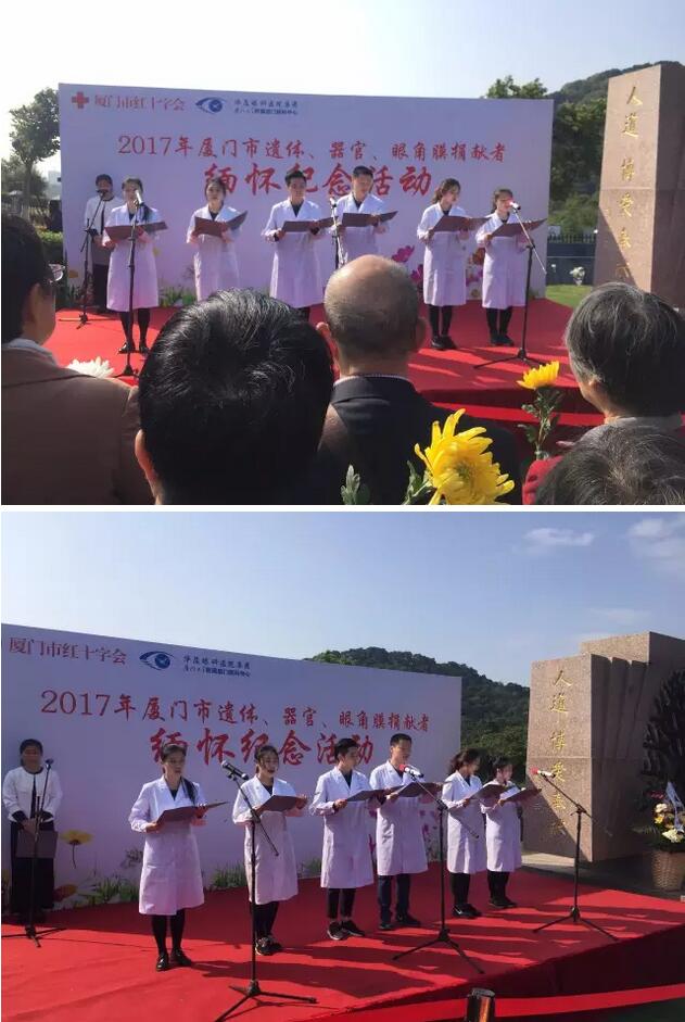 活動(dòng)中,廈門大學(xué)附屬?gòu)B門眼科中心醫(yī)務(wù)工作者們帶來了《生命的禮物》的詩(shī)朗誦表演,表達(dá)了對(duì)捐獻(xiàn)者無償獻(xiàn)出珍貴“生命禮物”的崇敬與感恩之情。廈門大學(xué)醫(yī)學(xué)院青年志愿者協(xié)會(huì)在紀(jì)念碑前宣誓并遞上了獻(xiàn)花。捐獻(xiàn)者紀(jì)念碑前,手捧白菊的人群中,有蹣跚而行的白發(fā)老人,有一臉稚氣的年幼孩童,更多的是中年人和青年人。人群中,有人哭泣,有人默默佇立,一遍遍撫摸著刻在紀(jì)念碑上親人的名字。