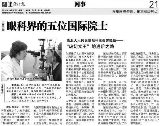 2018年10月30日,人民日?qǐng)?bào)社屬報(bào)紙《健康時(shí)報(bào)》對(duì)廈門大學(xué)附屬廈門眼科中心總院長黎曉新進(jìn)行大篇幅報(bào)道。
