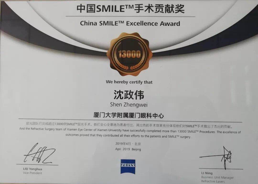 此次會(huì)議授予了沈政偉院長“中國SMILE™手術(shù)貢獻(xiàn)獎(jiǎng)”。此獎(jiǎng)項(xiàng)代表著對沈政偉院長的信任與肯定以及對廈門眼科中心的認(rèn)可,也代表著沈政偉院長在屈光手術(shù)方面的成就與榮譽(yù)。