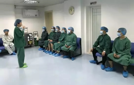 在工作人員的指引下,想觀摩近視手術(shù)的朋友被引導(dǎo)到手術(shù)室參觀。屈光手術(shù)中心陳美珠護士長為大家詳細介紹了近視手術(shù)的相關(guān)流程和注意事項,同時還回答了參觀者的一些問題。