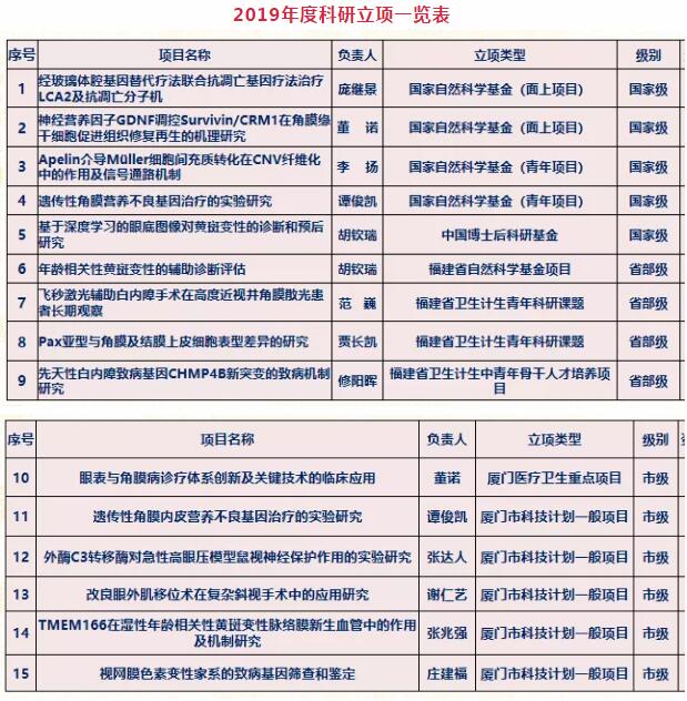 2019年全院發(fā)表SCI文章12篇,核心期刊文章31篇;5項(xiàng)專利獲得授權(quán);出版專著5部;在全國(guó)眼科年會(huì)投稿309篇,省級(jí)以上學(xué)術(shù)會(huì)議發(fā)言41人次。