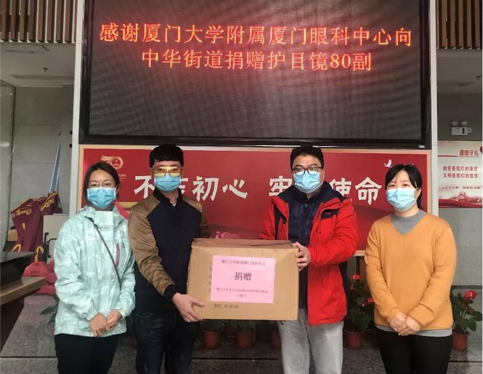 “主任您好,你們辛苦了。這是我們廈門大學(xué)附屬?gòu)B門眼科中心捐贈(zèng)的護(hù)目鏡,請(qǐng)您代表貴街道接收。相信我們會(huì)戰(zhàn)勝疫情,迎來美好的春天!”