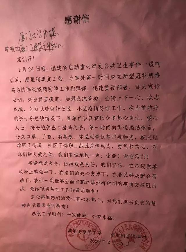 在中華街道辦,街道在LED大屏上打上了“感謝廈門大學(xué)附屬?gòu)B門眼科中心向中華街道捐贈(zèng)護(hù)目鏡”;廈港街道辦為醫(yī)院頒發(fā)了榮譽(yù)證書;還有湖里街道辦、金山街道辦等街道也寫了一封封誠(chéng)摯的感謝信。