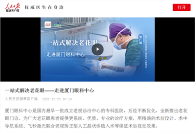 人民日報走進廈門眼科中心,專題報道老花眼診療,張廣斌院長受邀做專題采訪。海西晨報、海峽導報、東南早報、健康時報、今日頭條、百度健康、騰訊視頻、愛奇藝、新浪微博等十余個平臺聯(lián)袂報道!