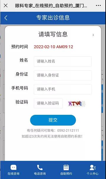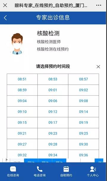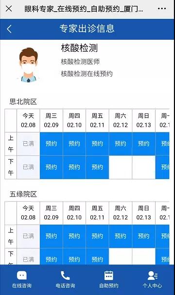預約步驟:預約到診-核酸檢測預約-醫(yī)療機構(廈門大學附屬廈門眼科中心)-選擇思北/五緣院區(qū)-選擇時間預約