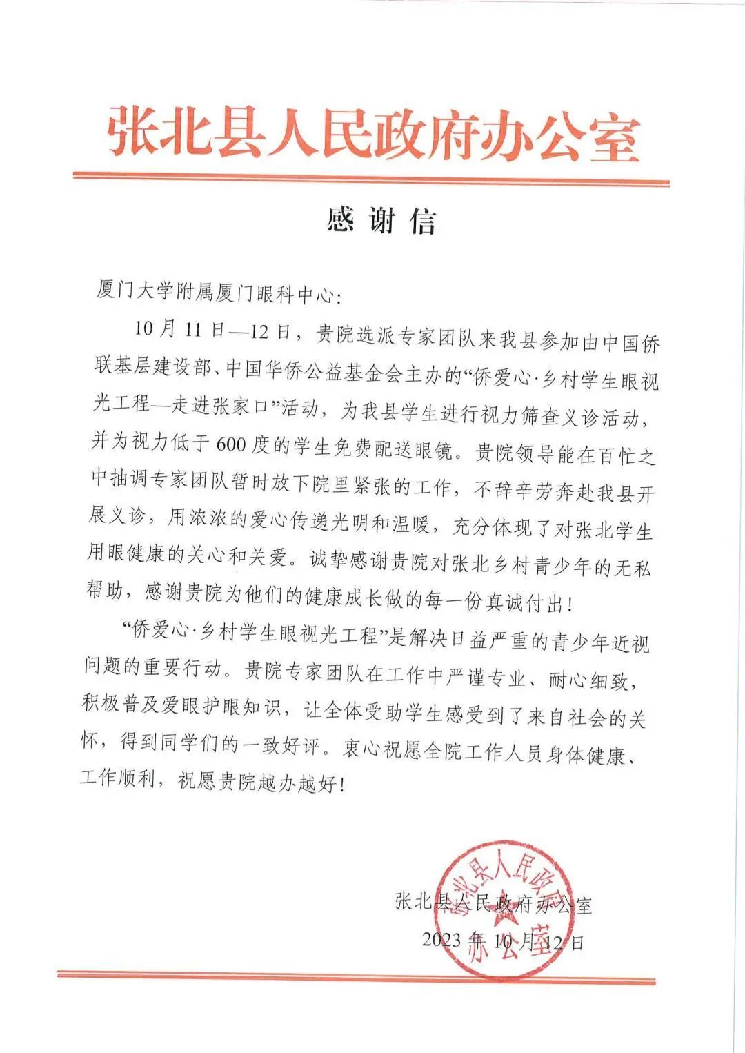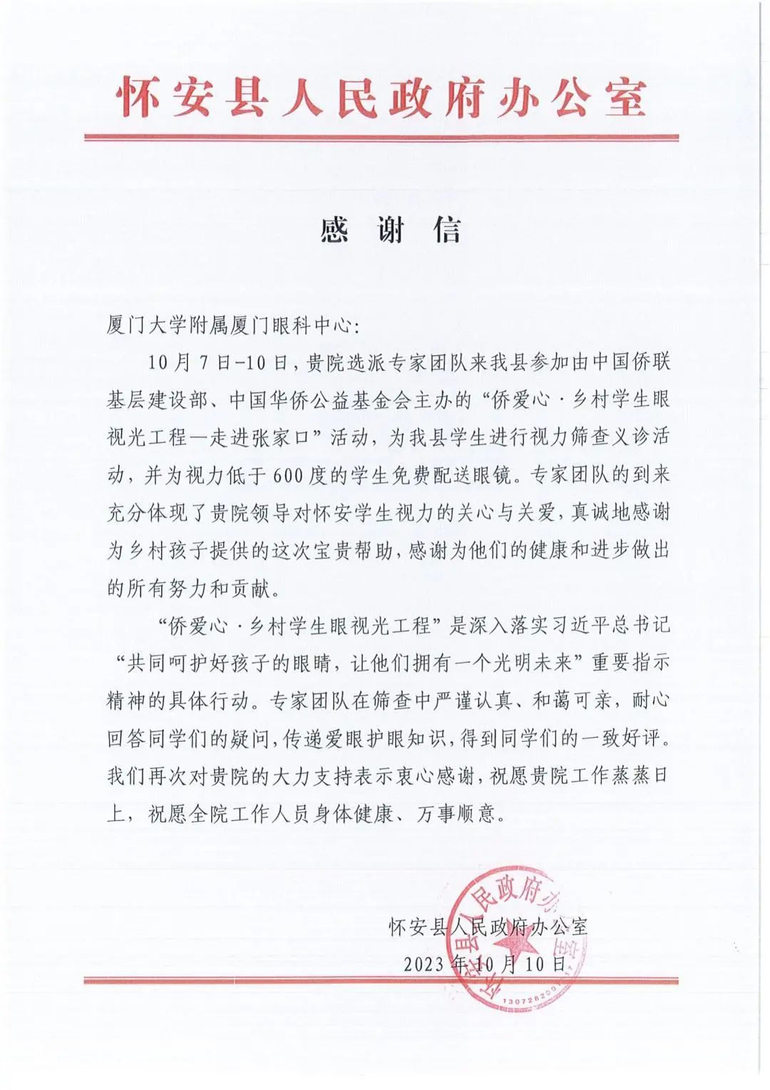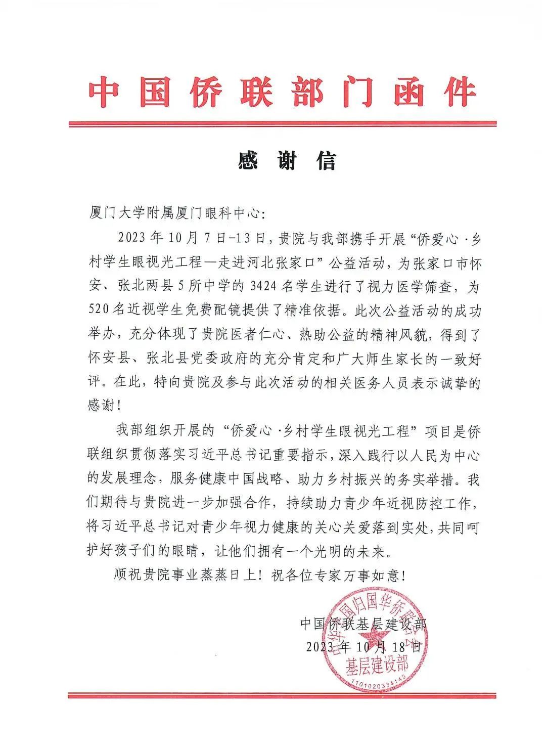 近日,廈門眼科中心接連收到來自中國(guó)僑聯(lián)基層建設(shè)部、懷安縣和張北縣人民政府辦公室的三封感謝信,信中對(duì)廈門眼科中心在“僑愛心·鄉(xiāng)村學(xué)生眼視光工程-走進(jìn)河北張家口”公益活動(dòng)中的無私付出及對(duì)鄉(xiāng)村孩子的寶貴的幫助給予充分認(rèn)可與真摯感謝。