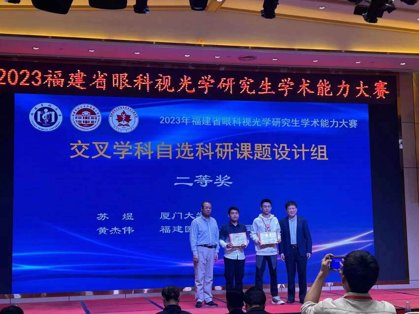 廈門眼科中心斜視與小兒眼病中心修陽暉博士指導的2023級專業(yè)型碩士研究生蘇煜代表廈門大學參賽,以嚴謹?shù)目蒲兴悸放c臨床思維,展現(xiàn)出良好的精神風貌和綜合素質(zhì),獲得在場的專家評委一致好評,最終以總分全省第二的好成績斬獲“交叉學科自選課題組二等獎”。