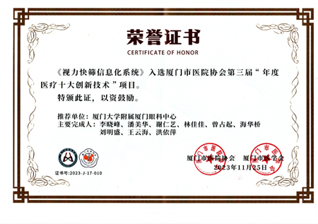 11月25日,在廈門(mén)市醫(yī)院協(xié)會(huì)第三屆年會(huì)暨“學(xué)科引領(lǐng)高質(zhì)量發(fā)展”學(xué)術(shù)會(huì)議上,廈門(mén)大學(xué)附屬?gòu)B門(mén)眼科中心“視力快篩信息化系統(tǒng)”榮獲廈門(mén)市醫(yī)院協(xié)會(huì)第三屆“年度醫(yī)療十大創(chuàng)新技術(shù)”項(xiàng)目,同時(shí)“視力快篩信息化技術(shù)推廣項(xiàng)目”經(jīng)國(guó)家衛(wèi)生健康技術(shù)應(yīng)用推廣項(xiàng)目專家論證會(huì)論證,成功入選中國(guó)民族衛(wèi)生協(xié)會(huì)2023年度“衛(wèi)生健康技術(shù)重點(diǎn)推廣項(xiàng)目”。