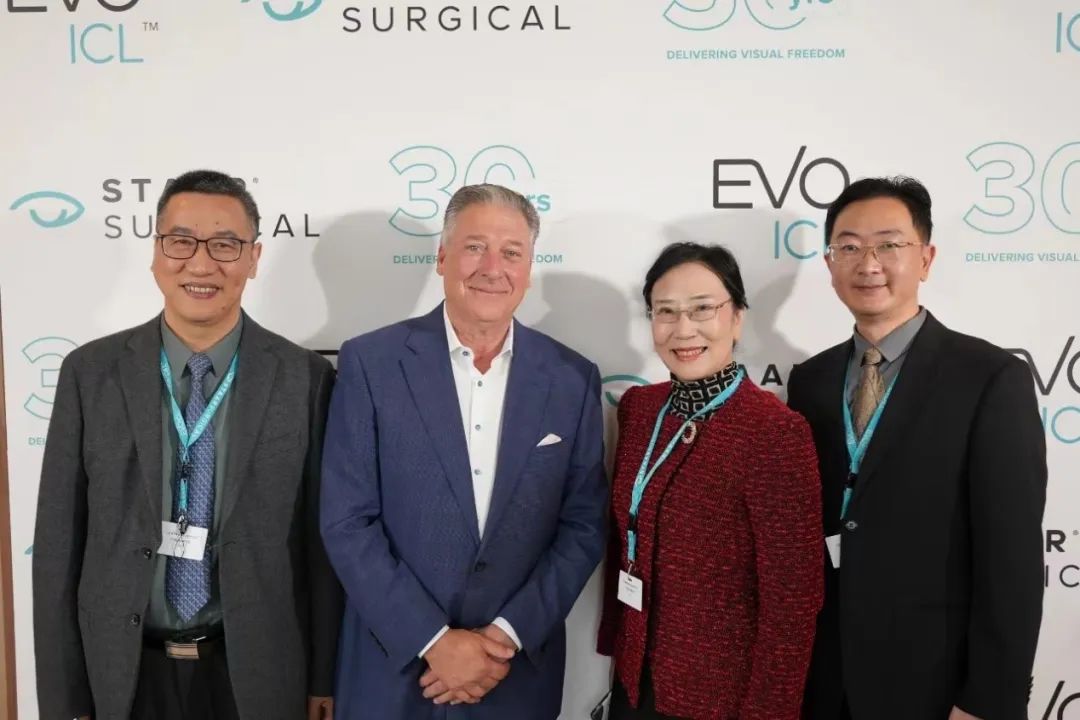 STAAR Surgical全球總裁 Tom Frinzi(左二)與廈門眼科中心屈光專家劉才遠(yuǎn)教授(左一)、陳亮教授(右一)合影留念