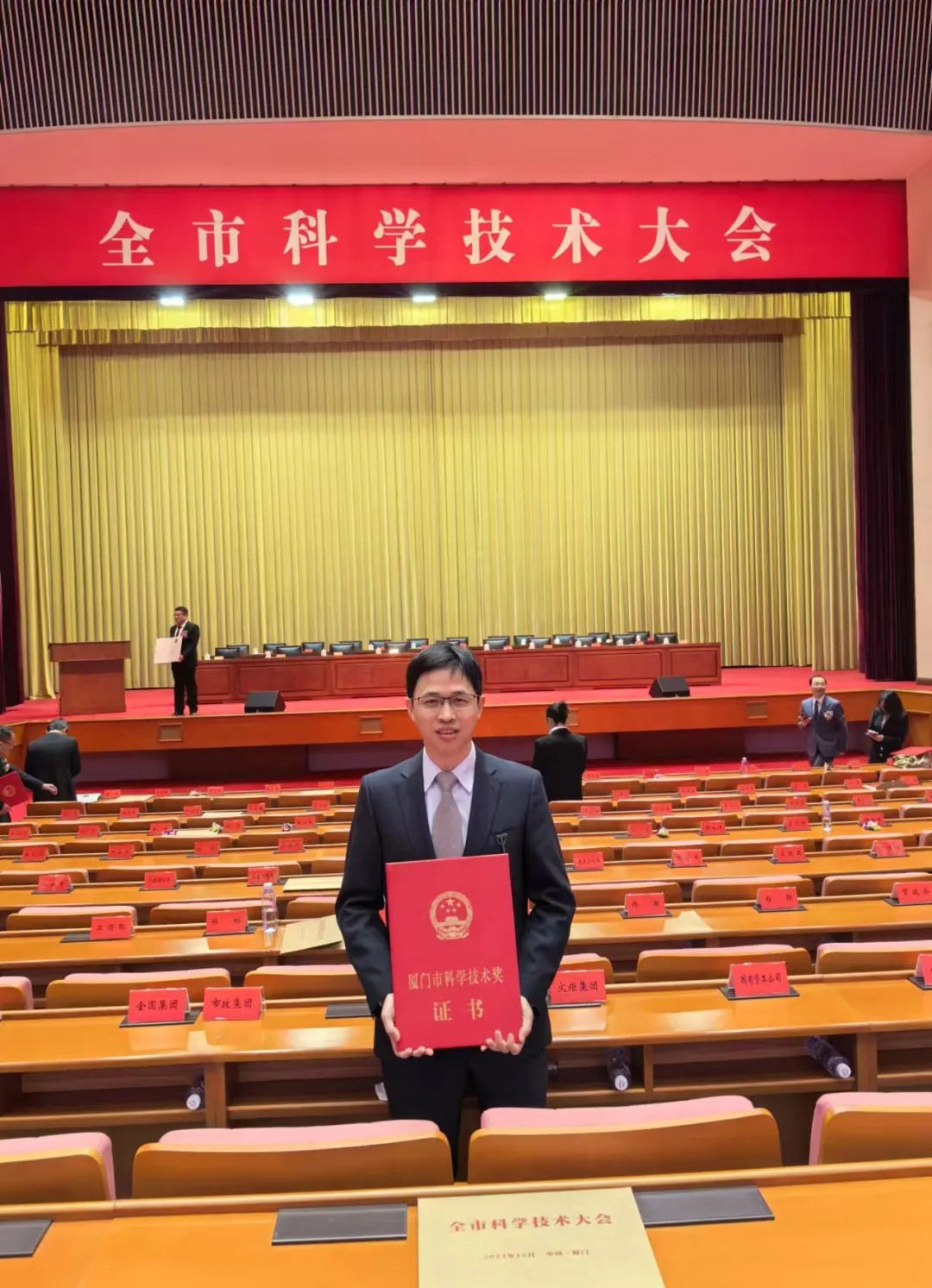 12月16日,廈門市科學技術大會在廈門人民會堂隆重舉行,大會現(xiàn)場為獲得2023年度廈門市科學技術獎的科研人員代表頒獎。由廈門眼科中心作為第一完成單位,斜視與小兒眼科修陽暉博士、眼外傷及眼底2科李海波博士所在團隊共同完成的“兒童眼健康防治體系的建設”項目喜獲廈門市科學技術進步獎三等獎,修陽暉博士應邀出席盛典并代表科研團隊領獎。