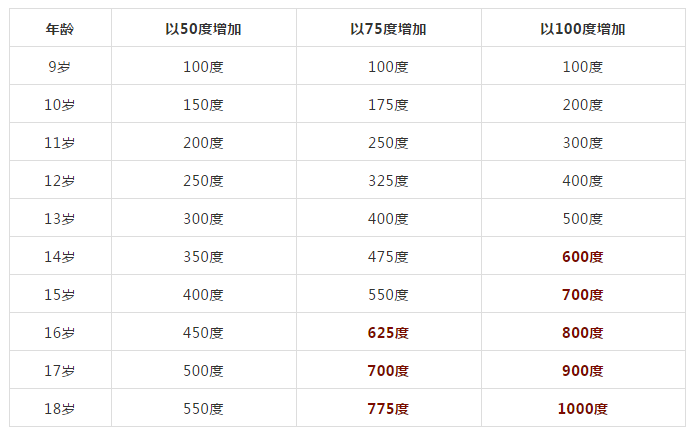 我們來做一個(gè)假設(shè),如果一個(gè)9歲的孩子近視100度,分別以每年50度、75度、100度的近視度數(shù)增長(zhǎng),結(jié)果竟然不到18歲,就已經(jīng)發(fā)展成了高度近視。