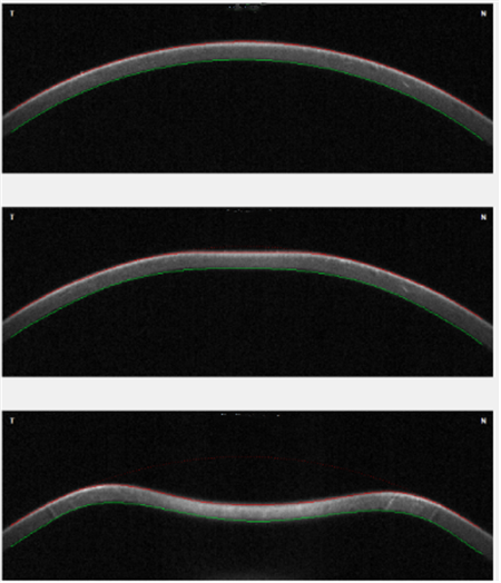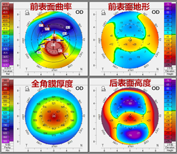 角膜地形圖可以精確分析角膜上任意地方的厚度、曲率等,觀察角膜前后表面曲率、瞳孔中心位置、角膜頂點和最薄點厚度,及時發(fā)現(xiàn)角膜的形態(tài)是否發(fā)生了變化。